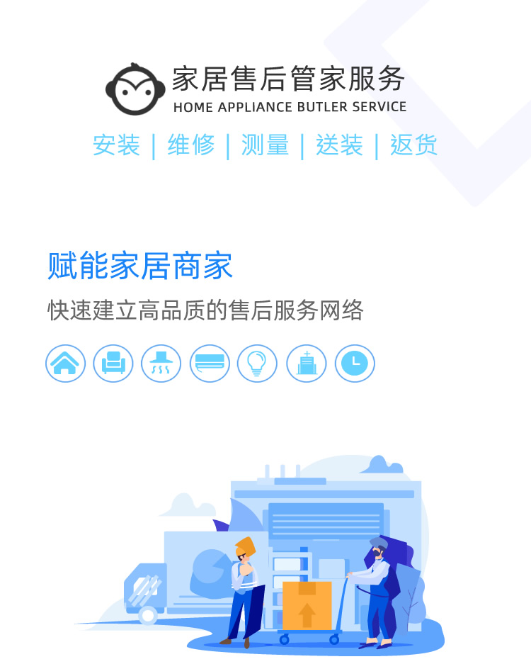 我是具备专业技能的家居师傅, 可以为商家或个人/家庭提供配送、安装、 维修、返货、疏通、清洗等服务。